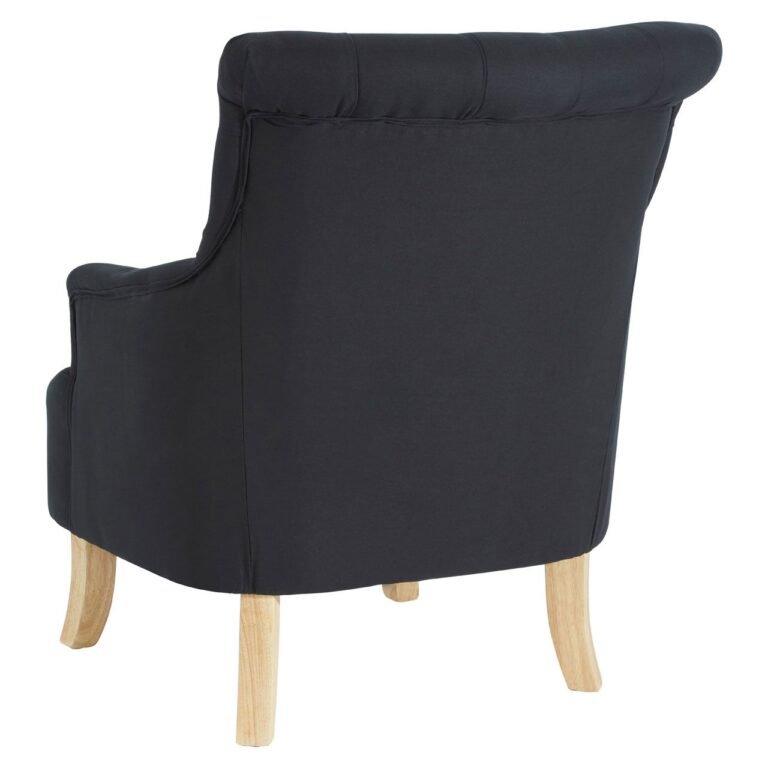 Kie Black Cotton Armchair: Supported on four short legs made of durable rubber wood, this armchair is one of the original product selection for our Fifty Five South luxury interiors brand. The rest of the chair is upholstered with a tough natural coloured blend of linen and cotton, making it a stylish addition to a neutral colour theme.