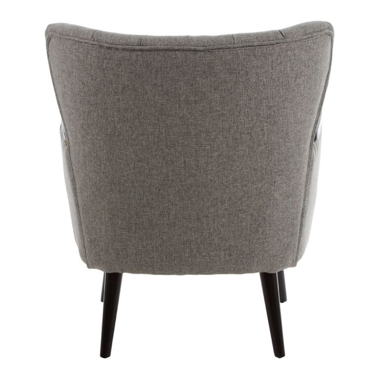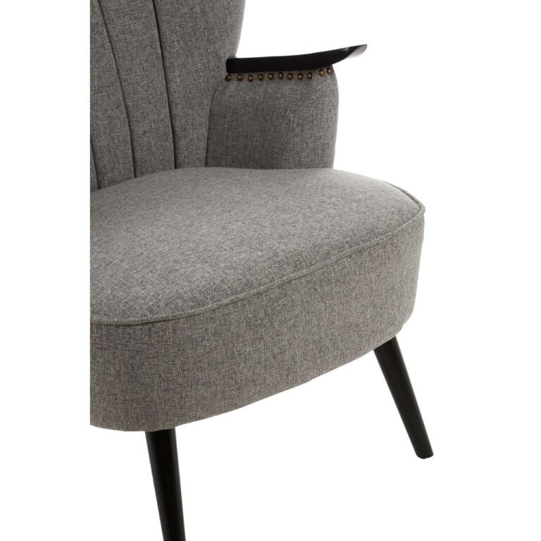 The Kie Grey Fabric Armchair is upholstered with textured fabric, with a grey colour that gives it an elegant and muted vibe. The curved backrest is accentuated by the vertical channel tufted lines, with two high armrests decorated with metallic stud detail and topped with dark walnut wood. The walnut wood legs complement the armrest and have a tapered design.