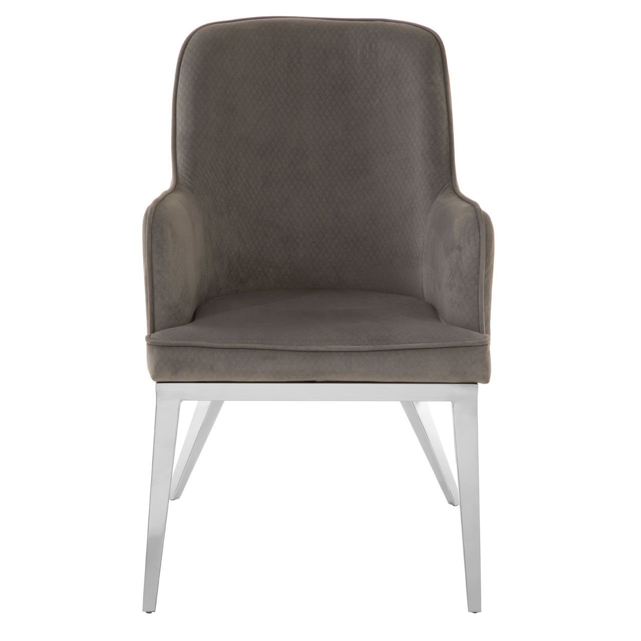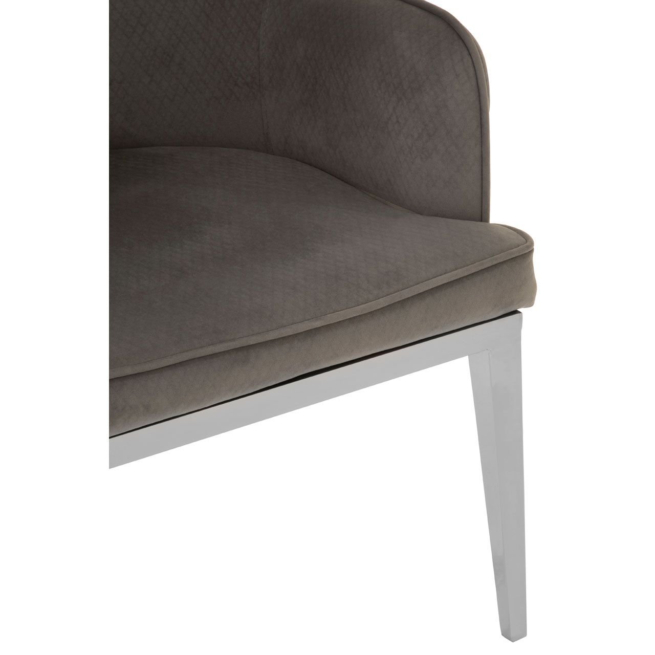 Liziere Black Velvet Dining Chair: The Liziere dining chair stands on four tapered legs, with the two back legs dramatically angling outwards, resulting in a striking silhouette. Created from stainless steel, the legs feature a reflective silver finish.
