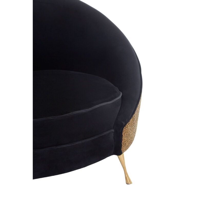 The Marston Leopard Print Armchair has a luxe-inspired leopard print pattern on its horseshoe-shaped sides. The gold is contrasted with the black velvet seat and backrest. Its legs have a brushed antique gold finish.