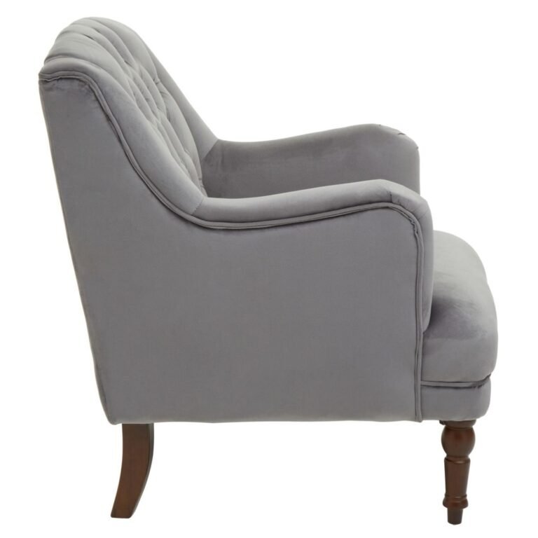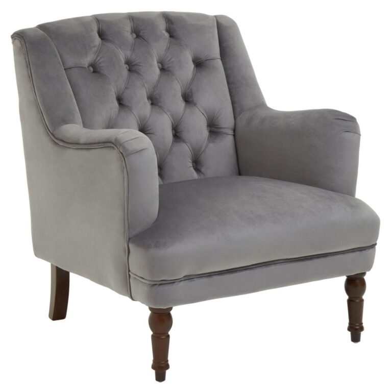 Norbury Grey Velvet Armchair: Covered in plush grey velvet, this armchair offers a sumptuous padded seat supported with a diamond detail button tufted back. Featuring ergonomic armrests for added comfort, the wooden legs of this chair lend style to the living area.