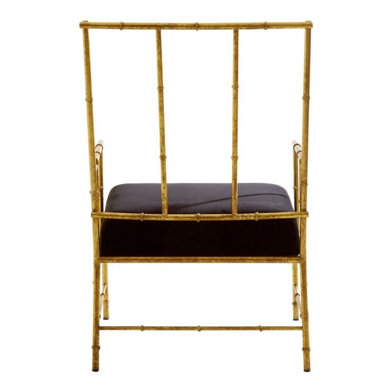 Oria Accent Chair: Its frame is crafted from iron and has a notched design that evokes bamboo rods. These are the only embellishments on an otherwise strikingly simple design. The gold finish is distressed to give the iron a textured look. A large and plump cushioned seat is dressed in tactile velvet. Coordinate with warm metallic accessories and lighting.
