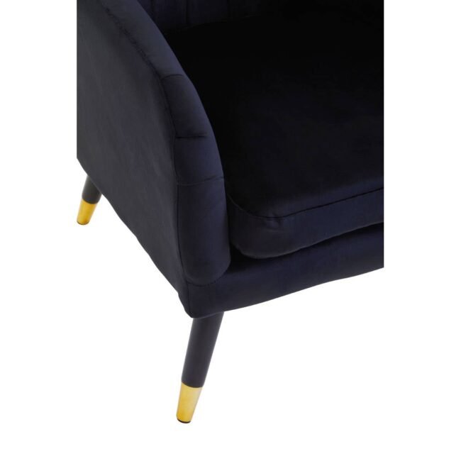 The Oriel Black Velvet Scalloped Armchair creates a sleek aesthetic. It is upholstered in black velvet which is complemented by the sturdy black legs which have a luxe gold tip at the end.