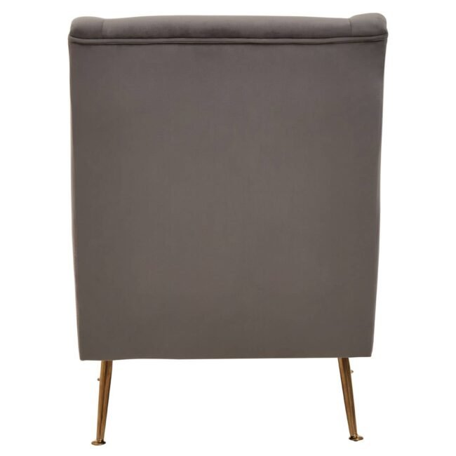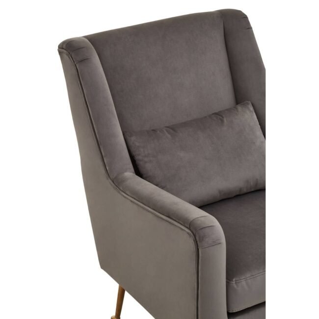 Upholstered elegantly in grey velvet, this chair has a high back with a foam padded seat. Complemented with straight arms and a matching cushion, it has angular gold finish legs that give it a midcentury modern style.