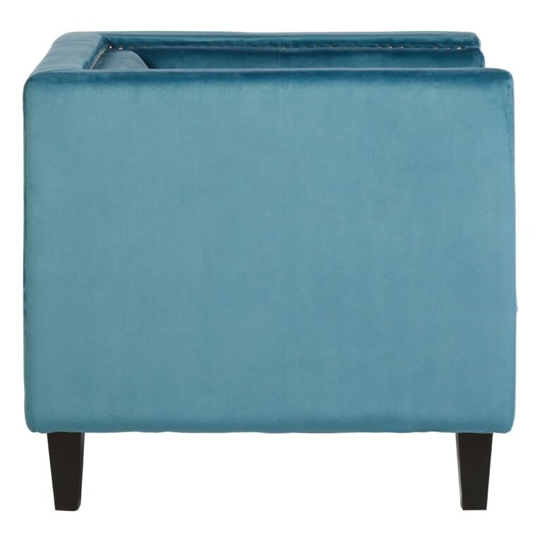 Salisa Blue Velvet Chair: Rich blue velvet upholstery gives the chair a soft and luxurious feel, with shallow button tufting lending a decorative touch to the backrest. The stylish chair has a square, angular design that is accentuated by silver finish metallic stud detailing. Two cylindrical cushions rest at each side, enhancing the elegant appeal of the chair.