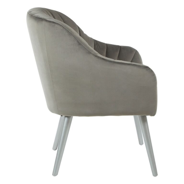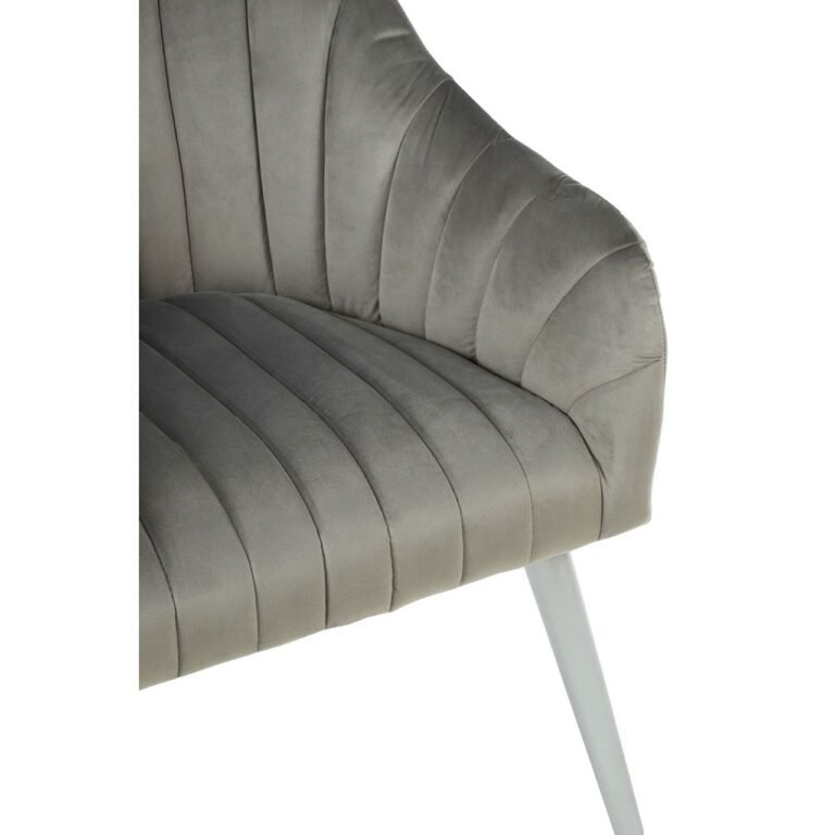 Upholstered in soft grey fabric, the Uxor Grey Fabric Armchair is tactile and luxurious to the touch. Its sloping armrests are accentuated by the chairs contemporary channel tuft detailing. Four cylindrical wooden legs are angled and feature a cool silver finish, harmonising with the muted, monochromatic upholstery.
