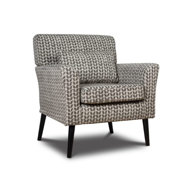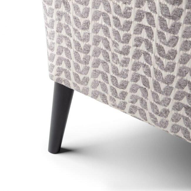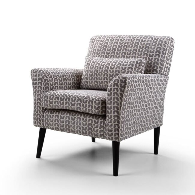 Warnborough club chair in grey patterned fabric, birch frame, legs painted black, cushion, polyurethane foam & hollow blown fibre filling. Made in the UK.