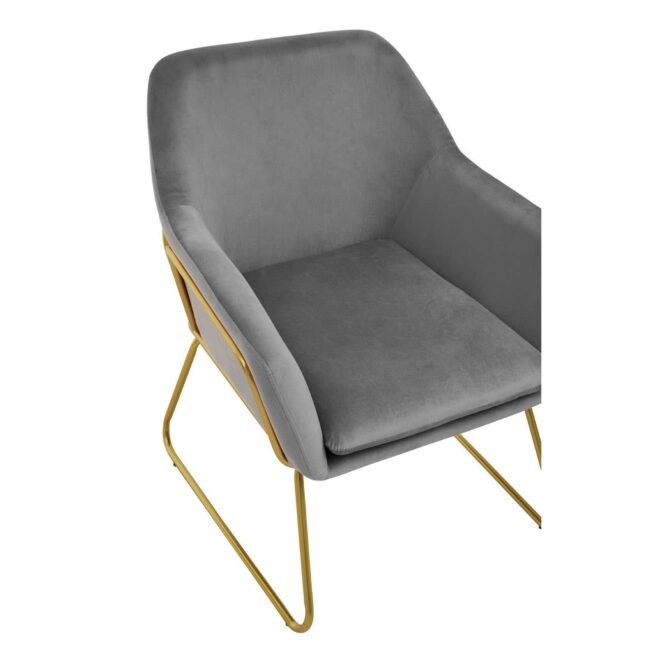 Upholstered in smooth grey velvet, this armchair has an ergonomic seat and backrest in foam padding for a comfortable seating experience. The sculptural gold finish sled base boasts a retro vibe and coordinates with the angular formation of the seat.
