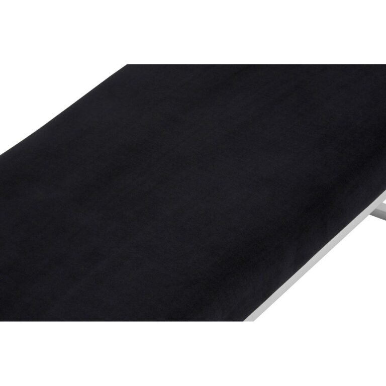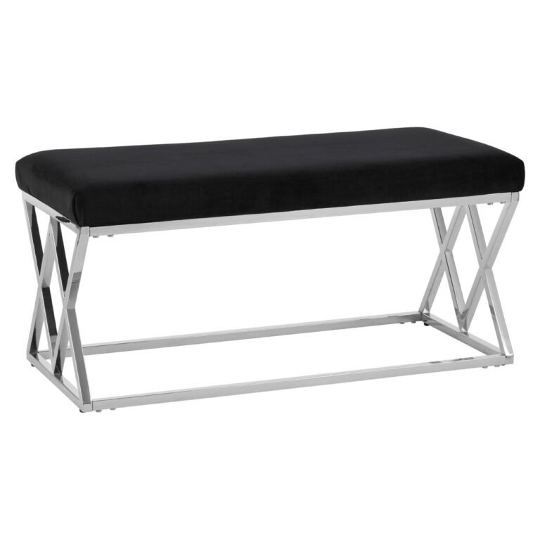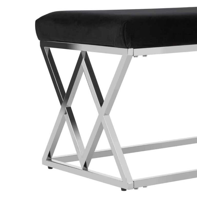 The base of the Alia black seat bench features simple angular design lines, broken up by the geometric pattern created at each end. Made from smooth stainless steel, it boasts a reflective silver finish. The thick cushioned seat is made from soft black velvet, creating a tactile counterpoint to the sleek steel. Coordinate with metallic tones.