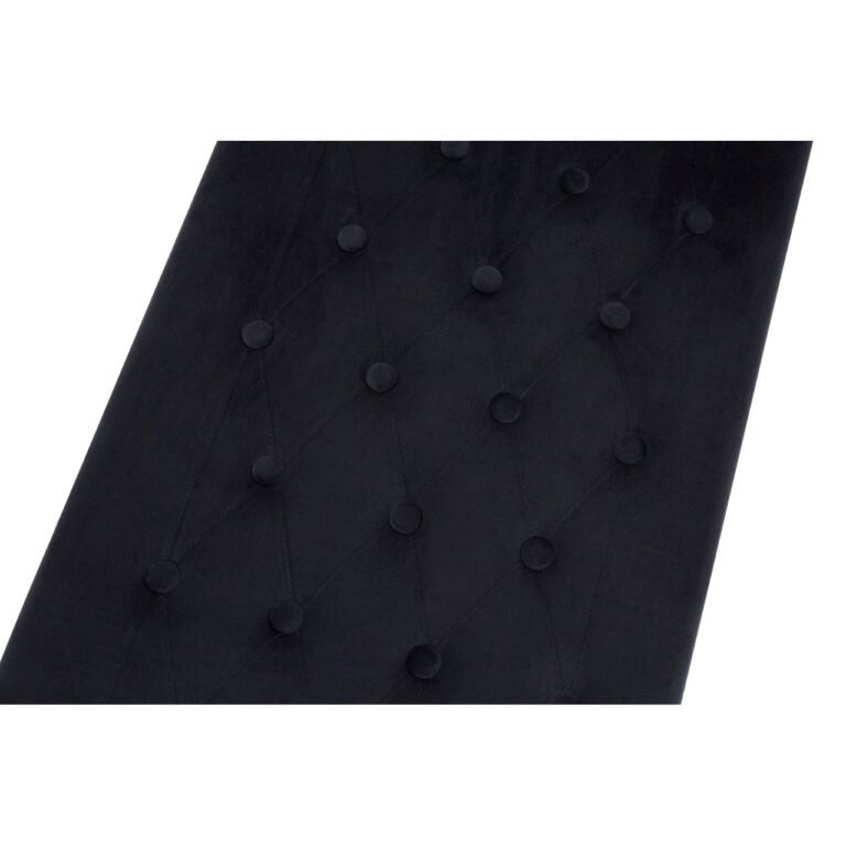 The Alia Black Tufted Bench cushioned seat is upholstered with soft black velvet. The button tufted finish adds a textured look and feel to this stylish accent piece. The base is made from stainless steel with a reflective silver finish that contrasts with the muted black upholstery. Both sides feature a suspended square for added visual depth.