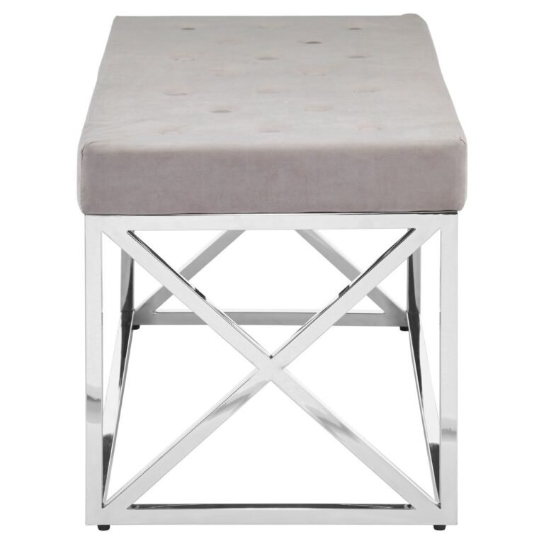 The base of the Alia bench features simple angular design lines, broken up by the geometric pattern created at each end. Made from smooth stainless steel, it boasts a reflective silver finish. The thick cushioned seat is made from soft mink-toned velvet, creating a tactile counterpoint to the sleek steel. Coordinate with metallic tones.
