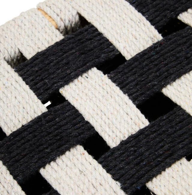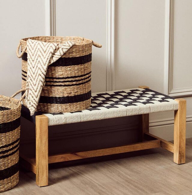 Singh Black And White Jute Bench: The Singh bench is handwoven with black and white jute rope, forming a checkerboard pattern, adding a touch of tactile texture and modern artistry. This is beautifully contrasted by the natural grain and warm tones of the mango wood frame, lending organic sophistication to the overall design. *Mango wood is highly sustainable due to its cultivation as a fruit tree. The wood used in this product comes from mango trees that have stopped bearing fruit. This allows the farmers to plant more trees.*