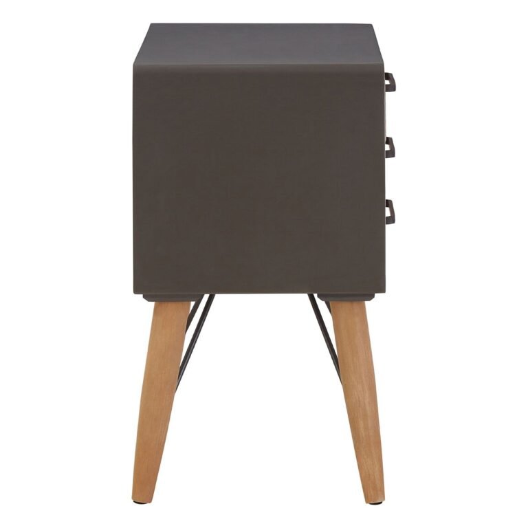 The Cromwell Side Cabinet With Two Drawers features two drawers, cleverly disguised to appear as three, allowing for additional depth to the bottom drawer. The grey iron handles have a rounded design that complements the cabinet’s soft edges. Each leg is made from sustainable fir wood, coordinating with the beautifully grained facing on each drawer. Slim iron trusses are finished in matching grey.
