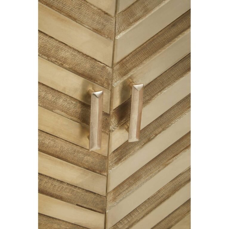 This two door cabinet is crafted from mango wood in rich gold and silver accents which combine to create an elegant chevron pattern. Sleek gold finish legs harmonise with the luxe detailing of this glamorous cabinet to create a statement.