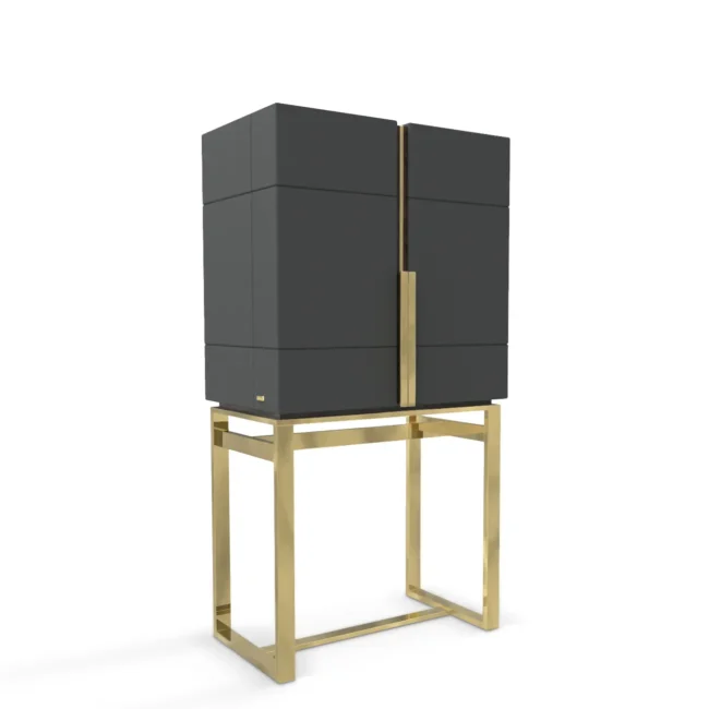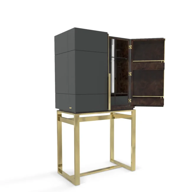 With its geometric lines and elegant shape, the Lloyd Bar Cabinet offers a timeless storage solution while effortlessly commanding attention as a striking accent piece in your interior. Crafted with top-notch materials including polished brass, grey leather, walnut root, smoked glass, smoked mirror, and Nero Marquina marble, this bar cabinet infuses a cosmopolitan touch into any winery or dining room.