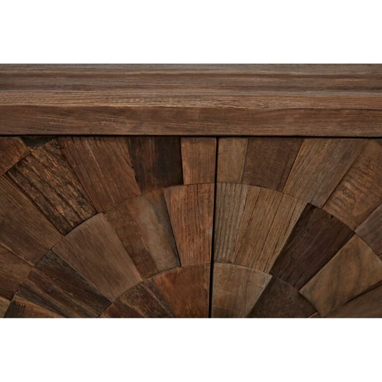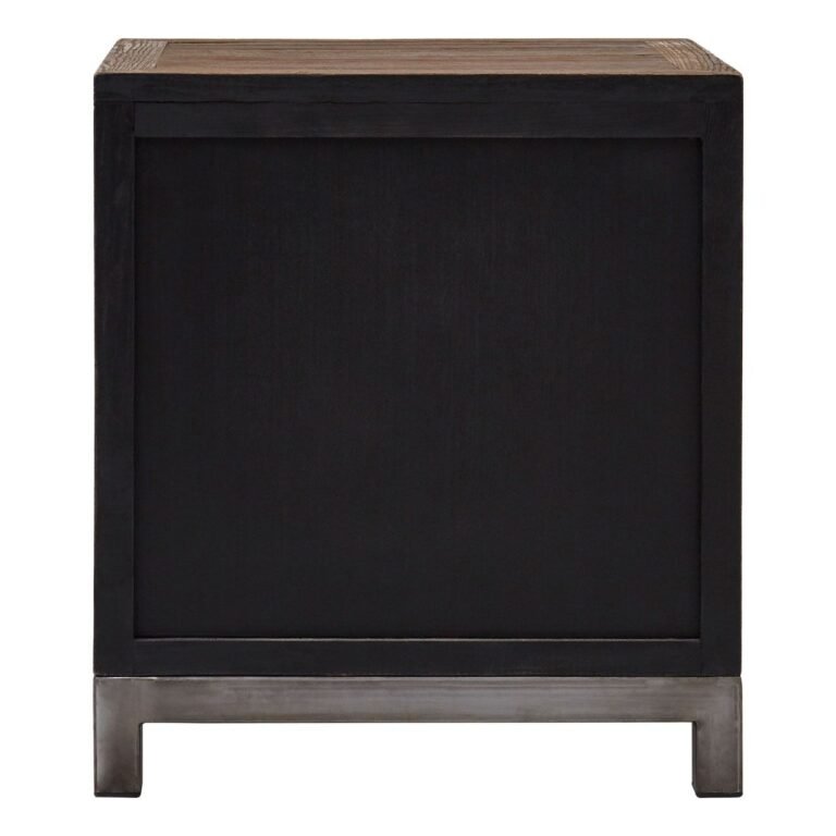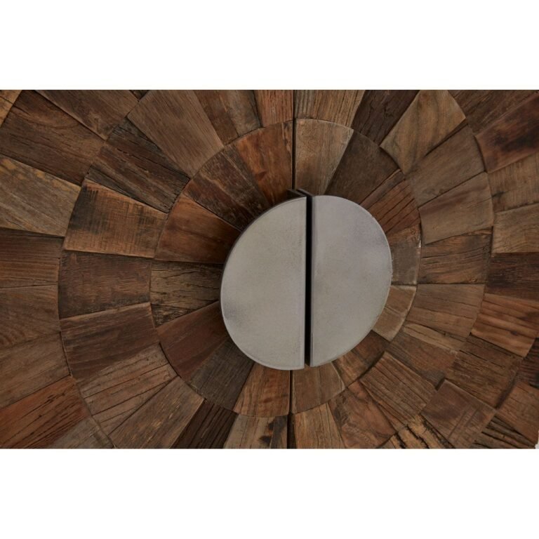 The Minia Small 2 Door Cabinet is supported by a minimal iron frame, coloured silver to complement the semi-circular handle that adorns each door. When the doors are closed the handles form a full circle that complements the surrounding textured pattern. The differently coloured strips of elm wood enhance the cabinet’s visual appeal.