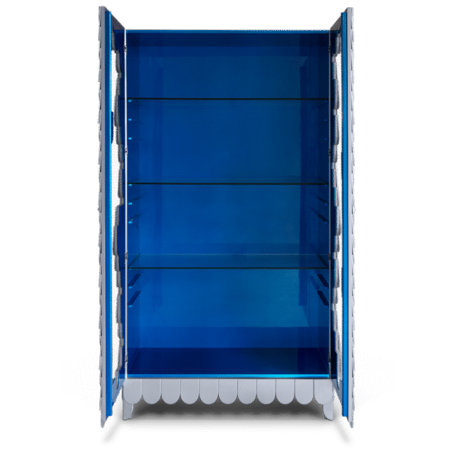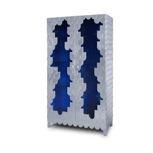 Silver leaf covered with translucent lapis high gloss varnish, wood, metal and glass.