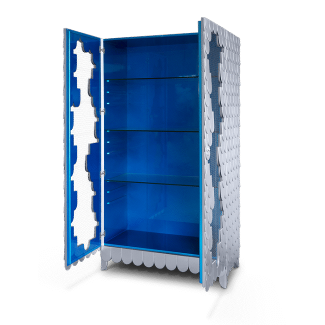 Cabinet in wood, finished with silver leaf. Its base has a metal reinforcement. In its interior, there are three shelves in glass. The handles have a lion shape and are finished with silver leaf. The interior is finished with silver leaf, with a high gloss translucent varnish.