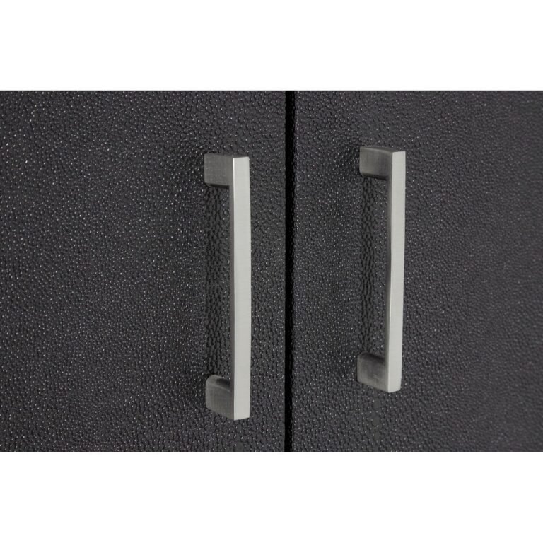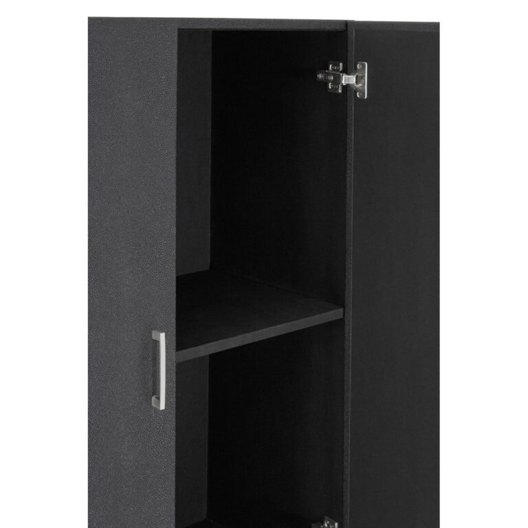 Pendlei Black Faux Shark Skin Small Cabinet: Combining sleek black and silver tones, this cabinet styles well with luxurious boutique hotel interior design settings. The polished stainless steel legs each form a rectangular shape, coordinating with the handles on each door. Behind the doors, four compartments offer discreet storage space. Textured faux shark skin covers the cabinet, its black finish counterpointing the silver.