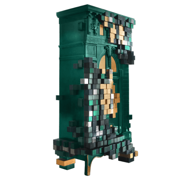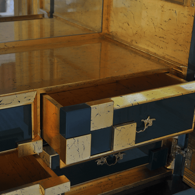 Piccadilly Cabinet made from poplar is the result of a meticulous craftsmanship and its completed in six different finishes: colored in dark and bright emerald green, black, gilded in age golden leaf. It contains four drawers and two shelves.