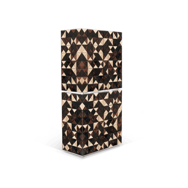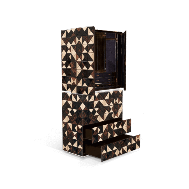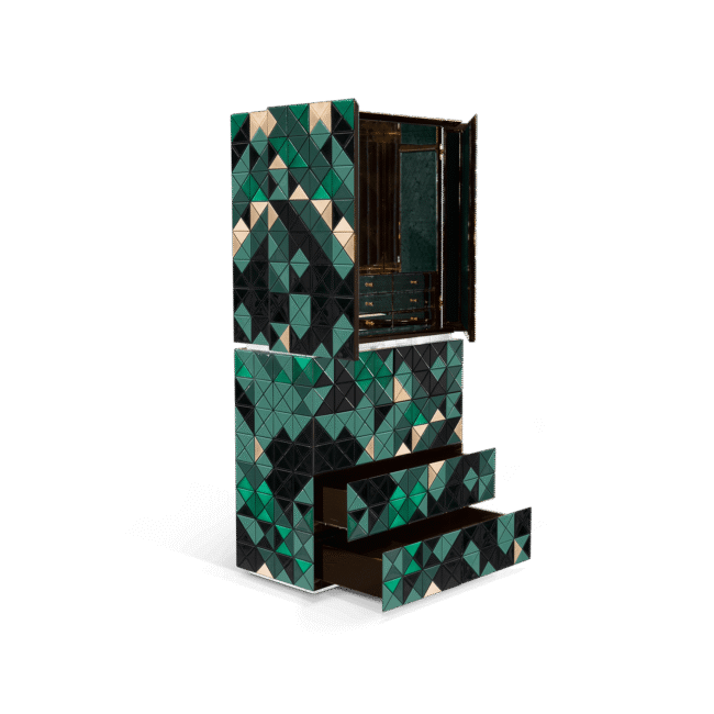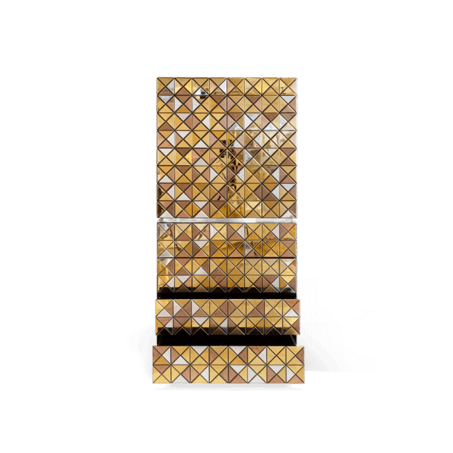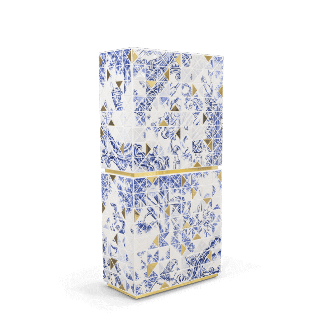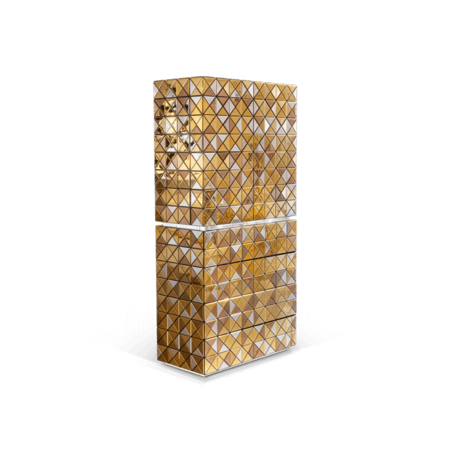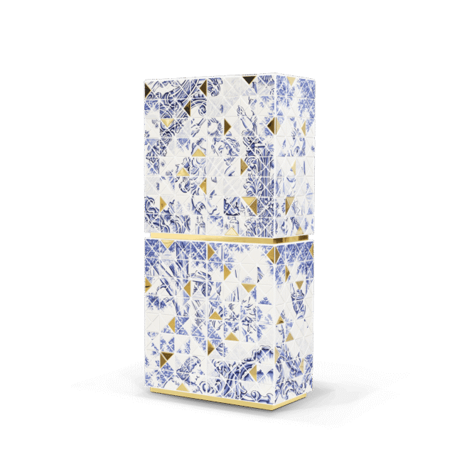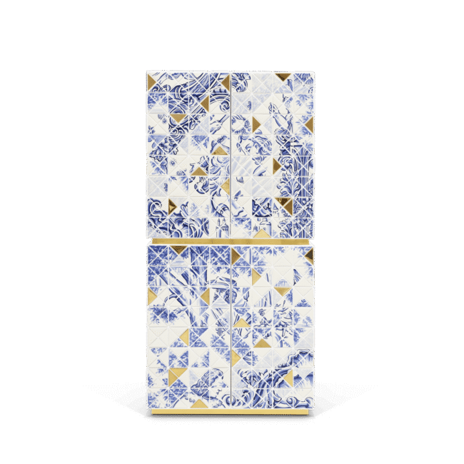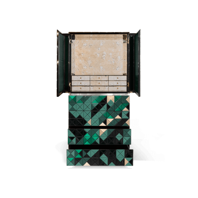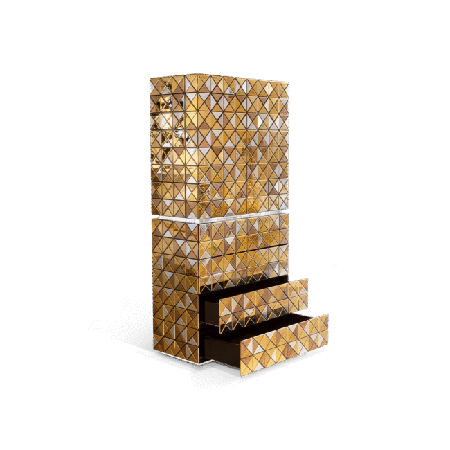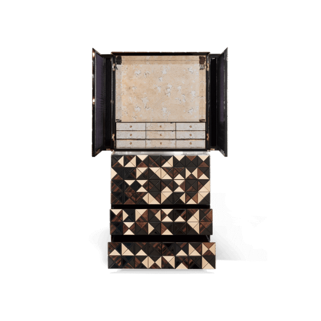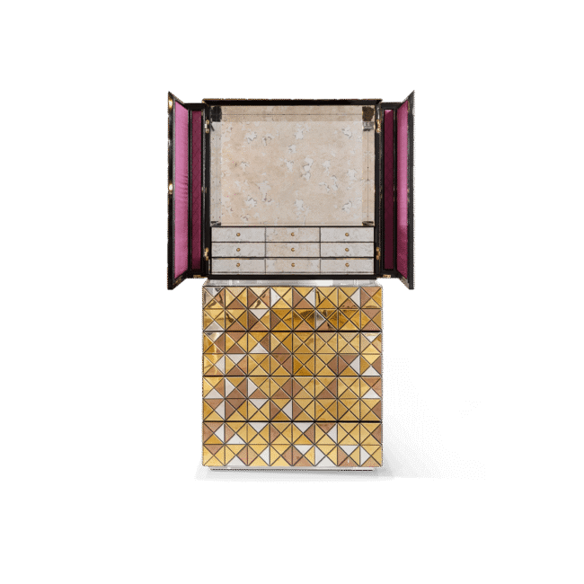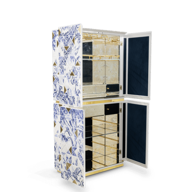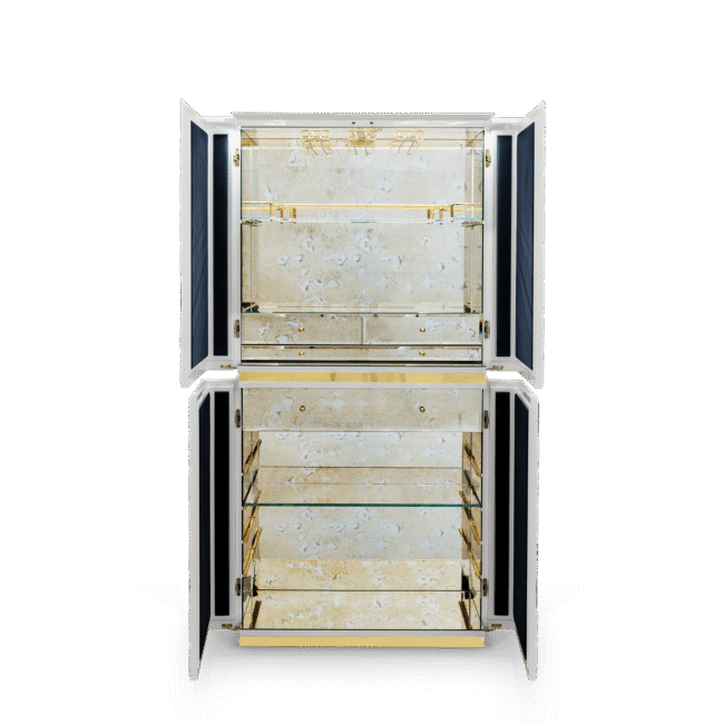 Handmade leaf gilding triangles, 10 different types of wood leaves from palisander to African walnut veneer and lacquering. Behind its two doors, a timeless combination of aged mirrors covers an open space containing nine interior drawers, each one with a golden exquisite knob. The doors are upholstered with diamond-quilted blue silk fabric.