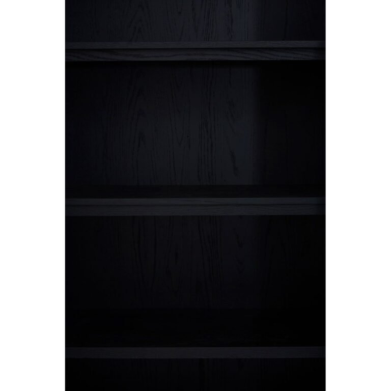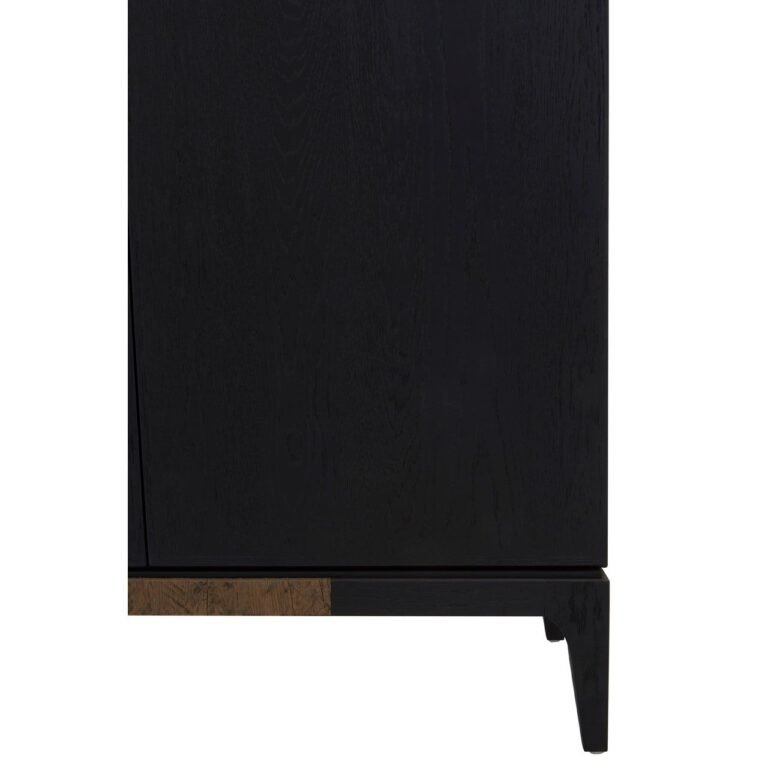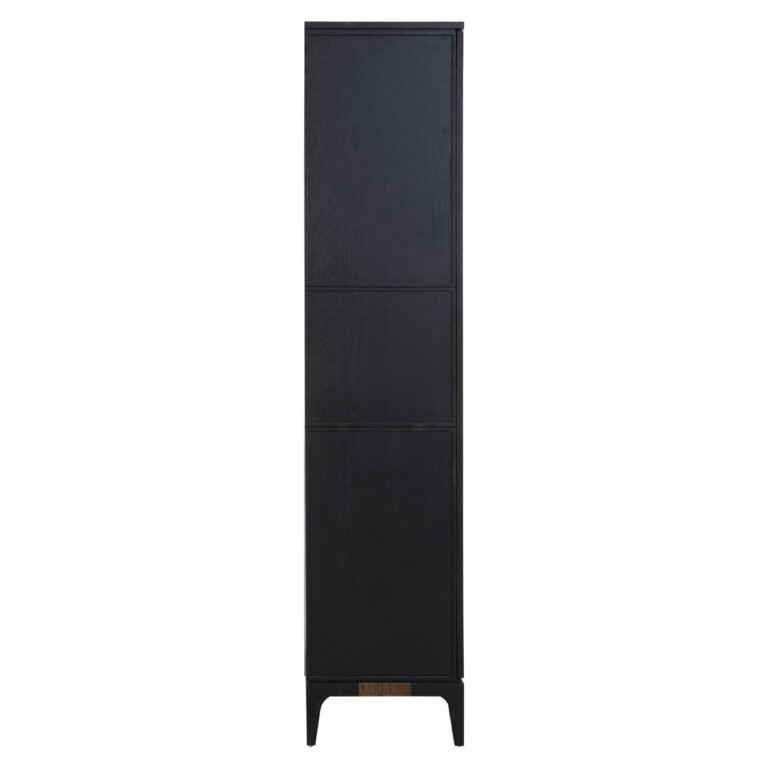 Railver 2 Door Cabinet: Crafted from solid oak wood, this cabinet with two hinged two doors reveals five storage shelves inside. The doors are finished with elongated linear pulls which are accentuated on the natural, richly grained central sections. Stylish yet simple, the black finish gives the cabinet a contemporary look.
