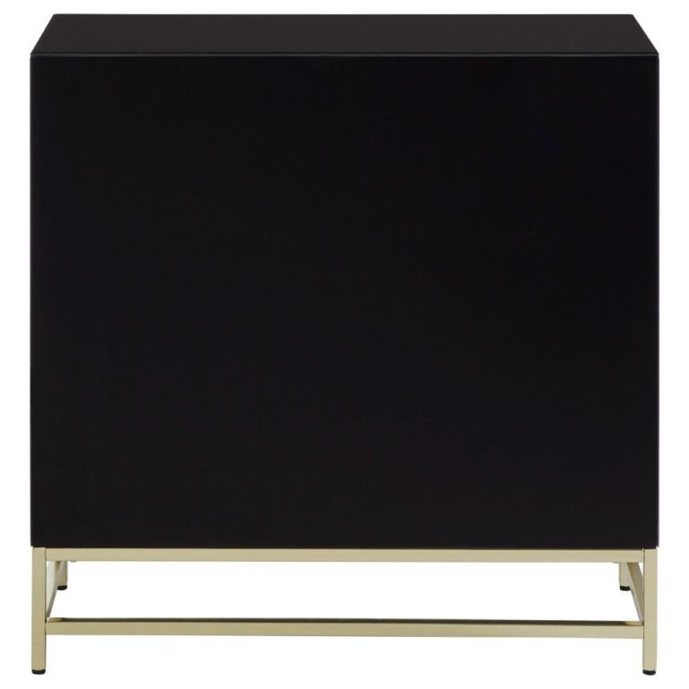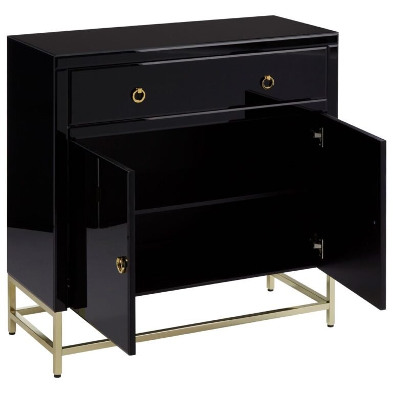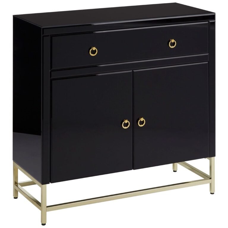 Regents Townhouse Black Cabinet: The Regents Townhouse cabinet is a luxurious statement piece. Its reflective gold coloured frame is made from stainless steel, and supports a sleek black cabinet. The cabinet has a large sliding drawer at the top, while a pair of doors below open to reveal a single shelf. Gold coloured handles contrast with the black finish.