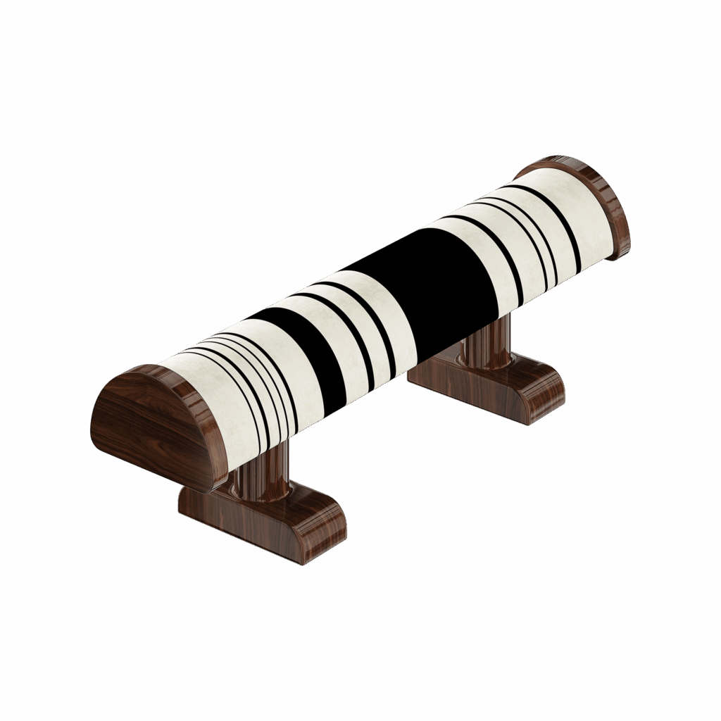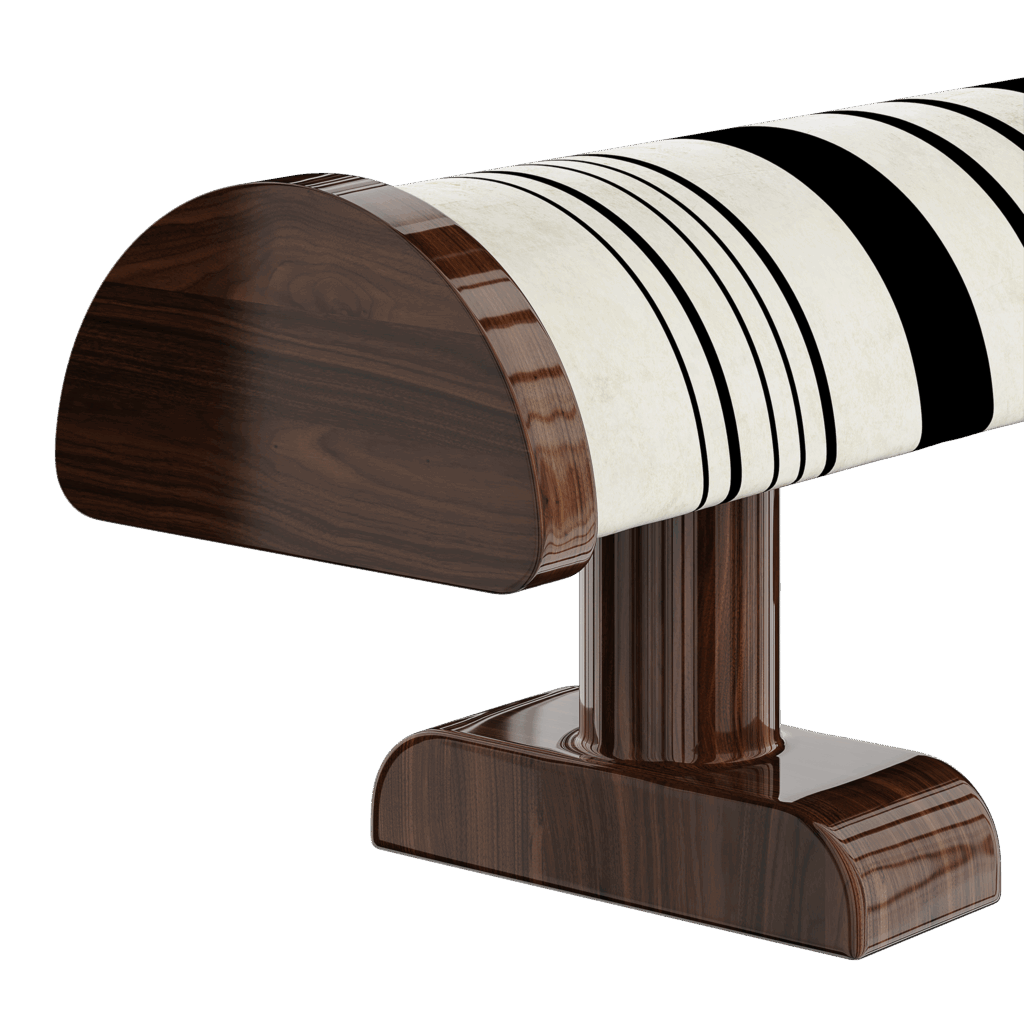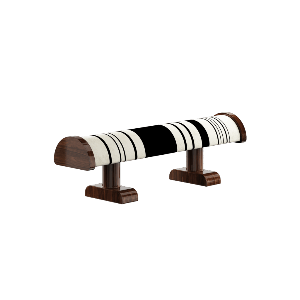 The Cella Bench is a beautifully designed piece that combines timeless craftsmanship and contemporary flair. Its striking black-and-white striped upholstery adds a bold, modern touch to the classic wooden frame, perfectly balancing tradition and innovation.