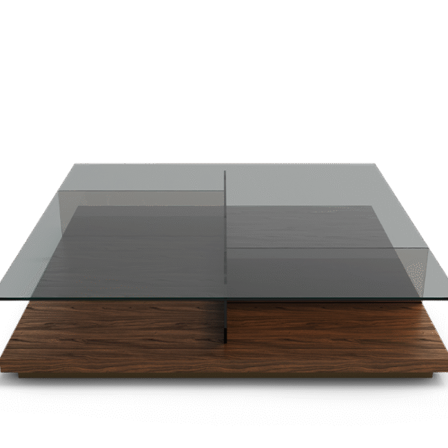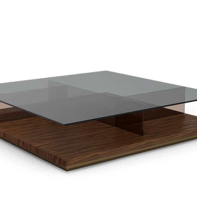 Odisha Center Table: Inspired by the vast plains of the Odisha region in eastern India, this centre table blends perfectly four materials into one exquisitely designed furniture piece. Subtle and contemporary by its design, but distinguished by its uniqueness and versatility. A smoked tempered glass top merges with bronze tempered glass for a contemporary feel, creating little compartments for utility as well. The two tempered glasses sit over a strong walnut veneer squared base with a refined epoxy dark bronze finish, brewing the perfect coffee table for all living room designs.
