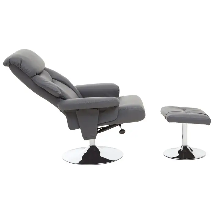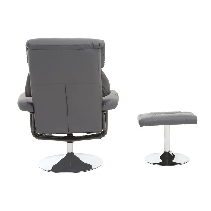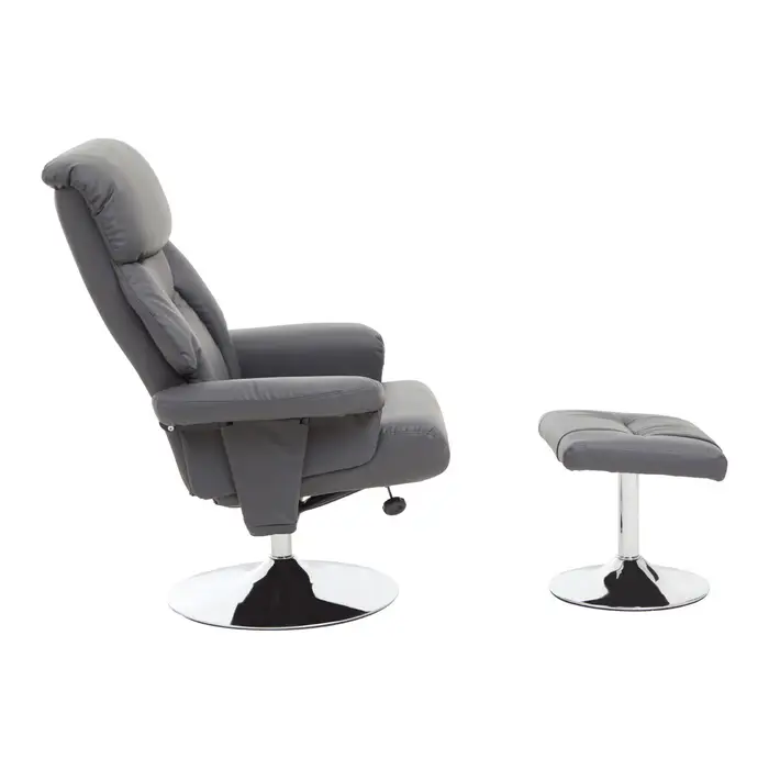 Minimal and offering sophistication to the living area, this Tenton Grey Leather Effect Chair And Footstool will ensure optimum relaxation. The fusion of grey PU leather and polished stainless steel base will make a contemporary addition to the urban-inspired decor. This chair is supported by ergonomic armrests and a matching footstool for added comfort. The adjustable backrest will ensure swift maneuvering.