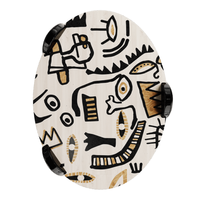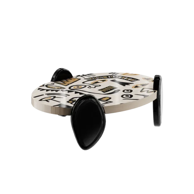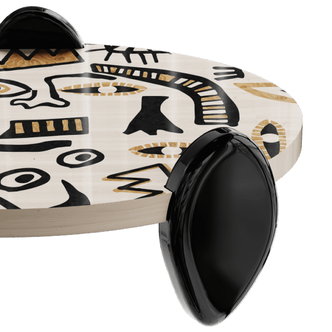 Coa Center Table adds an unmistakable design style to your home. Modern, bold, and elegant at the same time, this oval center table will be an eye-catching addition to any decor. A unique oval tabletop made in marquetry technique rests on drop-shaped legs. This center table reflects enigmatic symbols and compositions influenced by 20th-century multicultural heritage and pop-culture icons, the expressiveness of our times. The wood center table reflects impressive details, careful craftsmanship, and beautiful patterns. The marquetry center table is part of an artistic Marquetry collection, an emancipation of the most remarkable artists now in modern and contemporary shapes of curated furniture design.