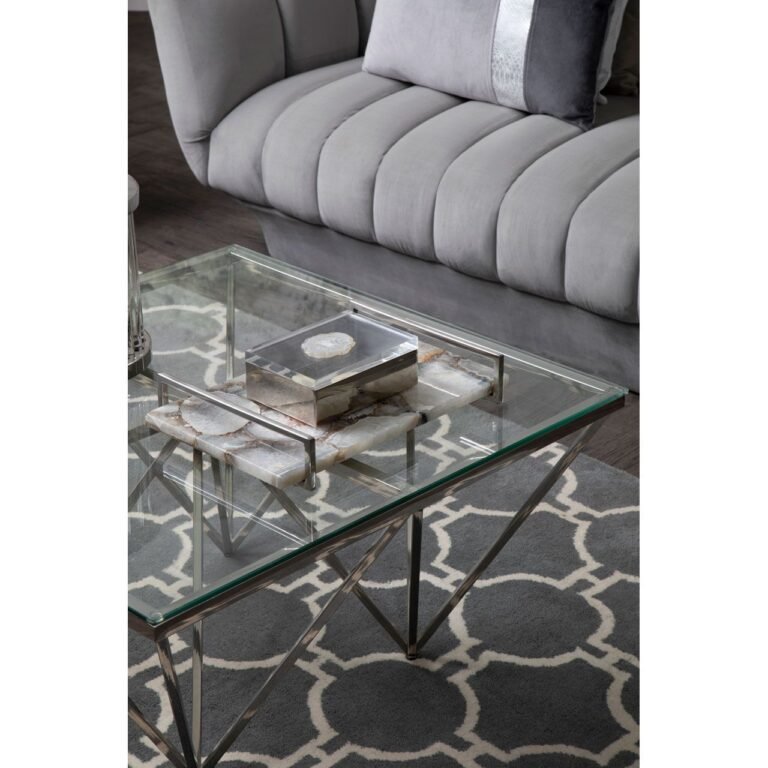 The four legs are made from smooth stainless steel and make a lasting impression thanks to their pincer-like design. Their reflective silver finish makes the table easy to coordinate with coolly-toned metallics. The silver finish complements the clear tempered glass on top.