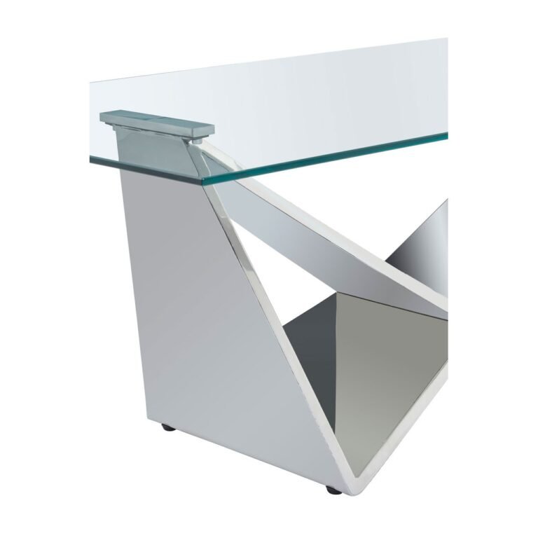 A pair of triangles made from sleek stainless steel are arranged at an angle beneath the clear tempered glass top. The steel has a reflective finish that complements the glass. Part of the Alia collection, it’s a great way to introduce a highly reflective accent piece to the living room.