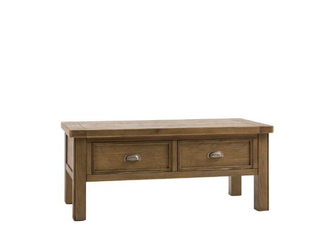 Ardwic 2 Drawer Coffee Table: Complete your living space with this elegantly practical coffee table. Crafted from natural wood solids & veneers, this table features two spacious drawers finished off with classic metal handles, perfect for keeping essentials neatly out of sight. The finishing details, warm wood, full of rich grains and a timeless interpretation of classic design make this stunning centrepiece for any living space, full of long lasting appeal.