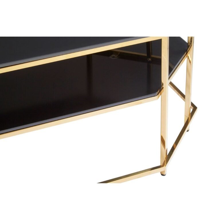 A luxe, sculptural piece, this Arelle Black Tempered Glass Coffee Table is sleek in design and finish. The black mirrored two-tiered shelving have a high gloss finish which is complemented by streamlined, gold finish legs, combining to form an encompassing hexagonal base. Style with coffee table books and candles to complete the luxe, boutique hotel look.