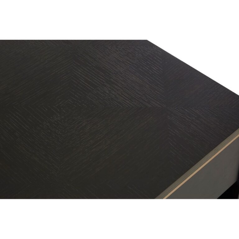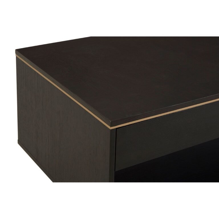 Atiere Coffee Table: The top of the Atiere coffee table is made from oak veneer and has a subtle etch pattern. The sustainable rubberood is left smooth and has a black colour that matches the oak. A wide drawer with two compartments provides storage, and gold finish trim adds warmth to the look.