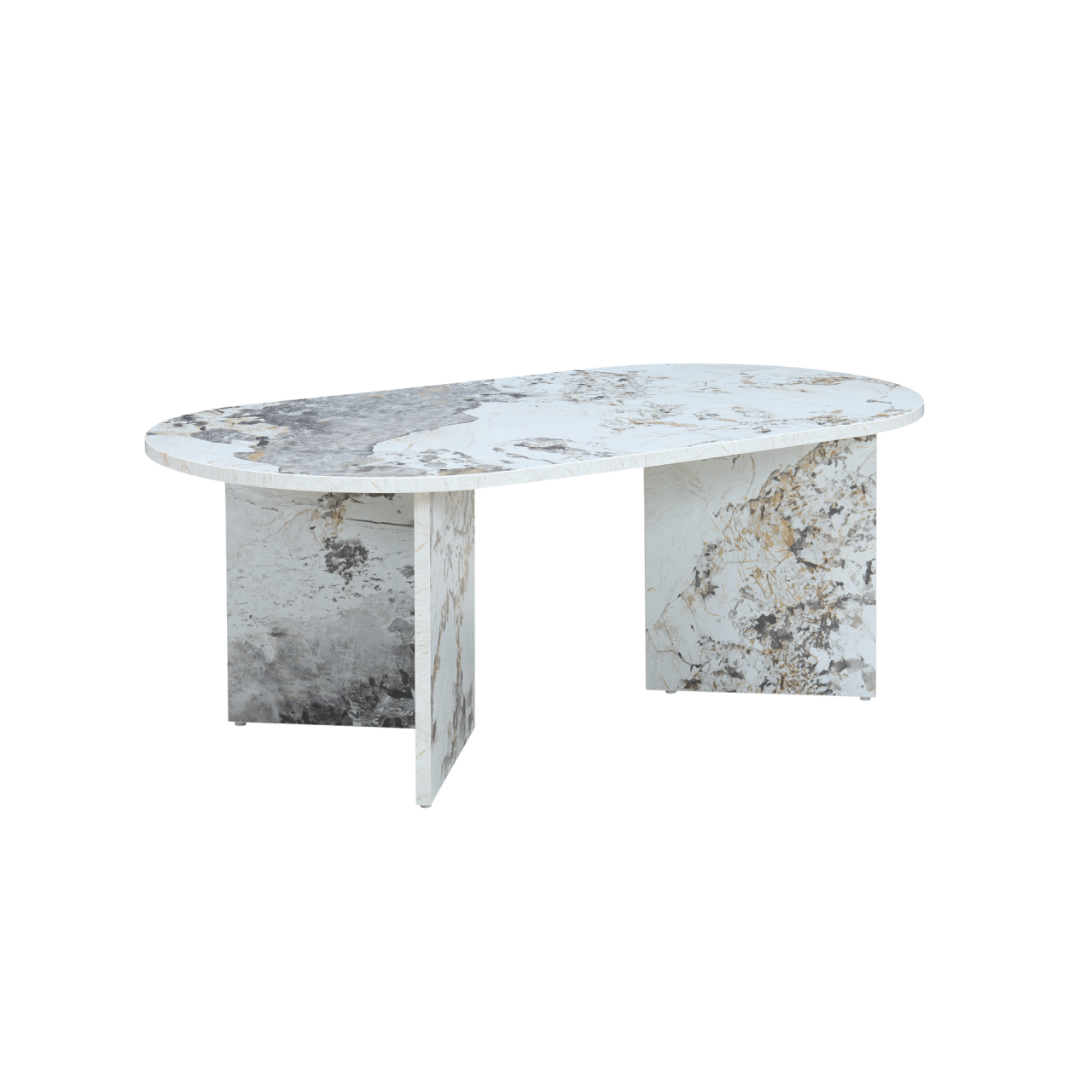 The Aura Oval Coffee Table features a striking, memorable silhouette and a trendy smooth, marble-effect finish. It has two chevron-shaped legs, which are pointed inwards, giving the piece a stylish and dynamic look. This is a low coffee table which can easily slot under other furniture forming a tiered design that will be a guaranteed focal point in any living room. Designed with sustainable materials, it supports a modern, eco-friendly lifestyle.
