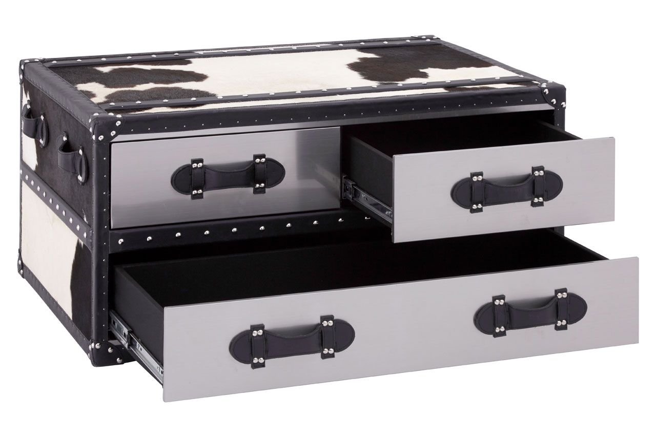 This stylish Black/White Oie Genuine Cowhide Coffee Table adds an animal print accent to the living room. Its three drawers boast sleek aluminum facing, with genuine leather strap handles contributing to the monochrome look. Reflective metal studs glint against the genuine leather trim that borders the table. Decorative handles at the side accentuate the travelling trunk look. *This product is made from genuine cowhide. Individual units are likely to have slightly different colors, textures, or markings from the image as this is a natural material*