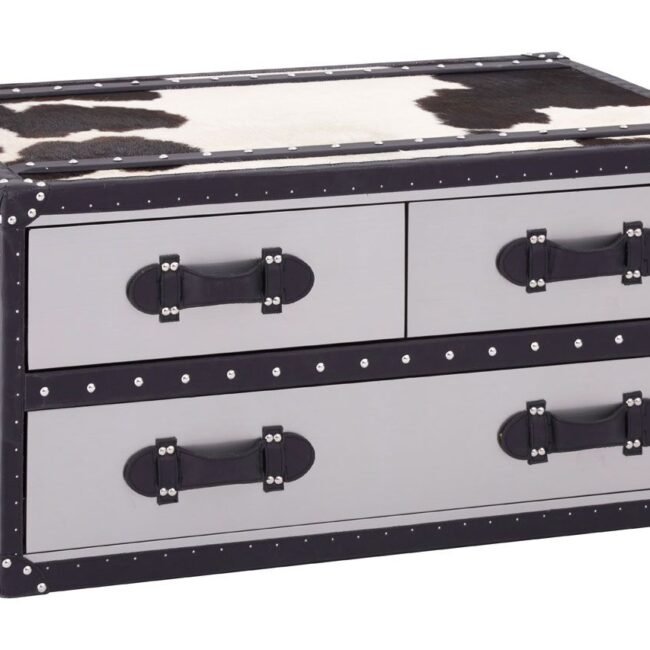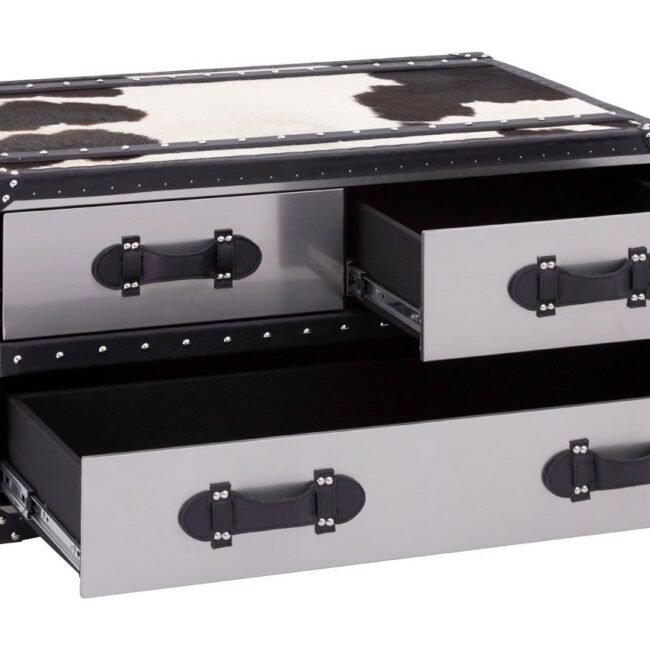 This stylish Black/White Oie Genuine Cowhide Coffee Table adds an animal print accent to the living room. Its three drawers boast sleek aluminum facing, with genuine leather strap handles contributing to the monochrome look. Reflective metal studs glint against the genuine leather trim that borders the table. Decorative handles at the side accentuate the travelling trunk look. *This product is made from genuine cowhide. Individual units are likely to have slightly different colors, textures, or markings from the image as this is a natural material*