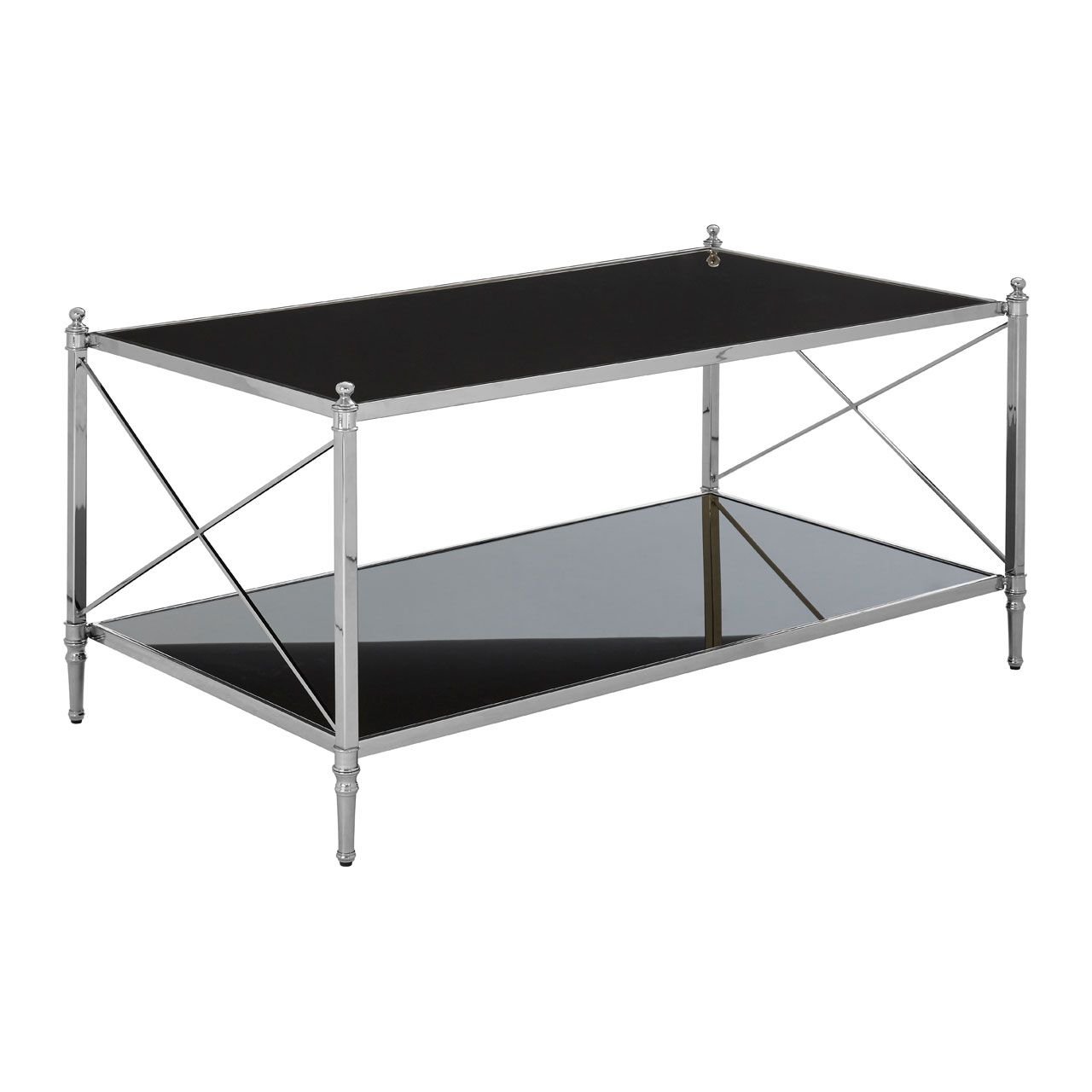 Camden Coffee Table: Two large rectangular shelves created from black mirrored glass are supported by an elegant metal frame, boasting a reflective silver finish. A contemporary cross design at each side connects the elegant curved feet to the tabletop and adds a decorative element.