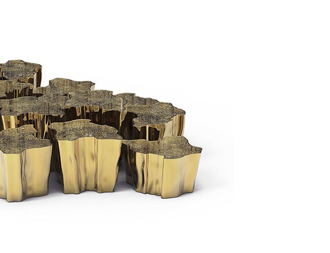 Born from master artisans and the ancient technique of polished cast brass, these statement design pieces incorporate nature-inspired design with industrious welding techniques, being manually assembled, making each piece unique. With delicate lines and bold details, a manually engraved top exposes the heart of a golden tree, boasting a sinuous gold plated base that stood the test of time. It is available in groups of 7, 8 or 14 pieces, with different heights, for unexpected combinations.