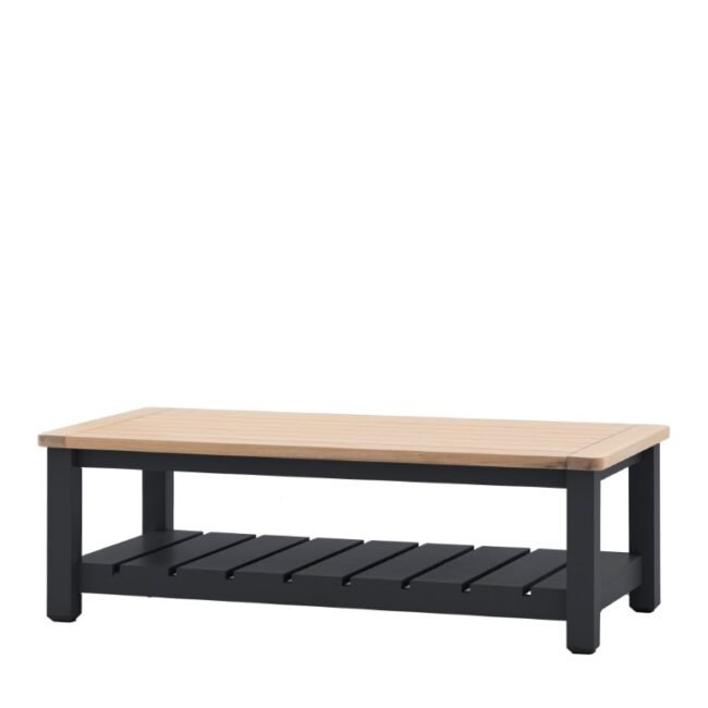 This coffee table is simplicity at its best. The oak top and clean lines make it perfect for a variety of interiors from modern to rustic. The hand painted wood contrasts with the grooved & planked oak top creating a modern twist on a classic farmhouse table. With a storage shelf underneath perfect for books or magazines, it offers a practical and stylish choice.