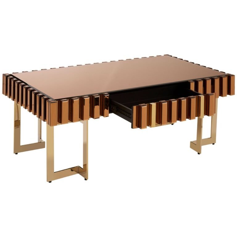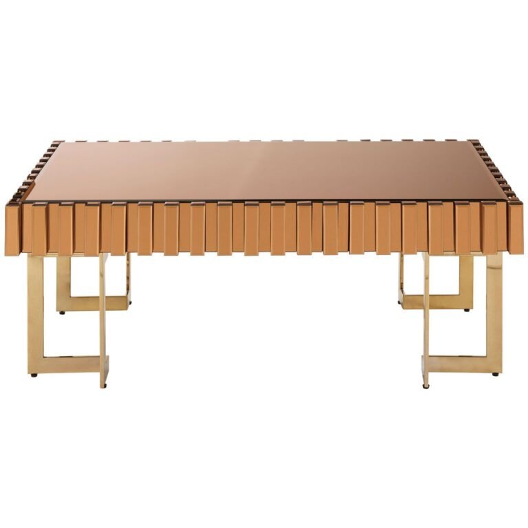Ieevoli Coffee Table: The corrugated sides give the table a textured look, contrasting with the smooth mirrored glass which is set into the top. Its legs are crafted from smooth stainless steel and have a luxurious gold finish.