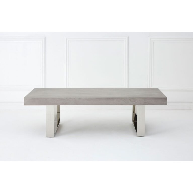 Lamus Grey Elm Wood Coffee Table: The tabletop is made from natural elm wood, its grey and silver tones accentuated by the distinctive interlocked grain. The squat stainless steel legs produce the table’s low slung stance, with a u-shaped design that complements the tabletop’s rectangular form. A combination of subdued and reflective surfaces, display it with boutique hotel style furniture and textiles.