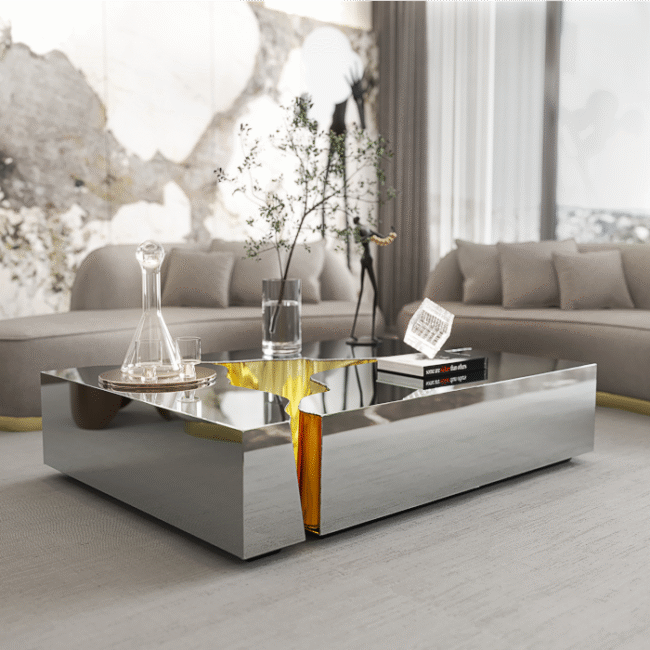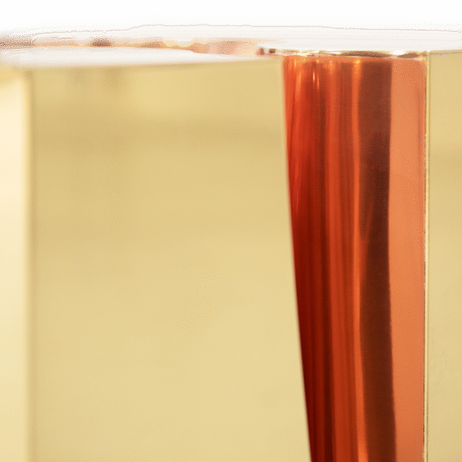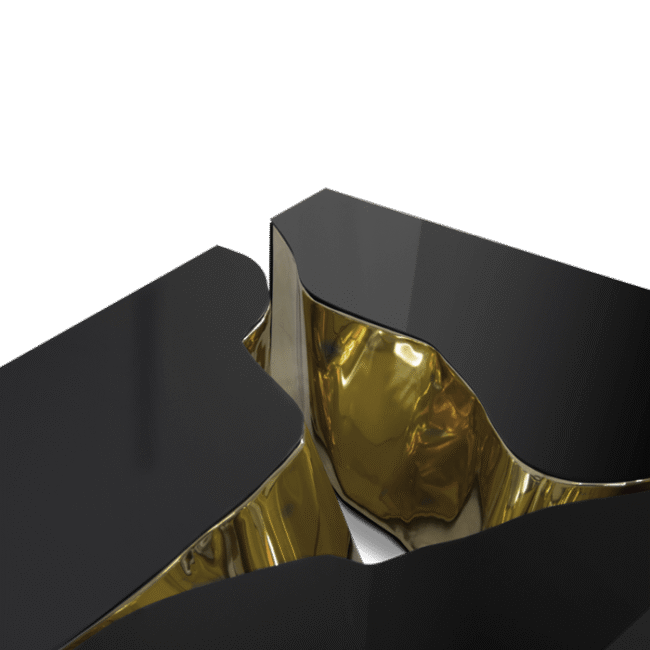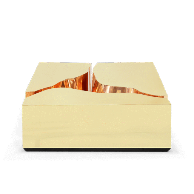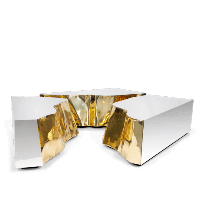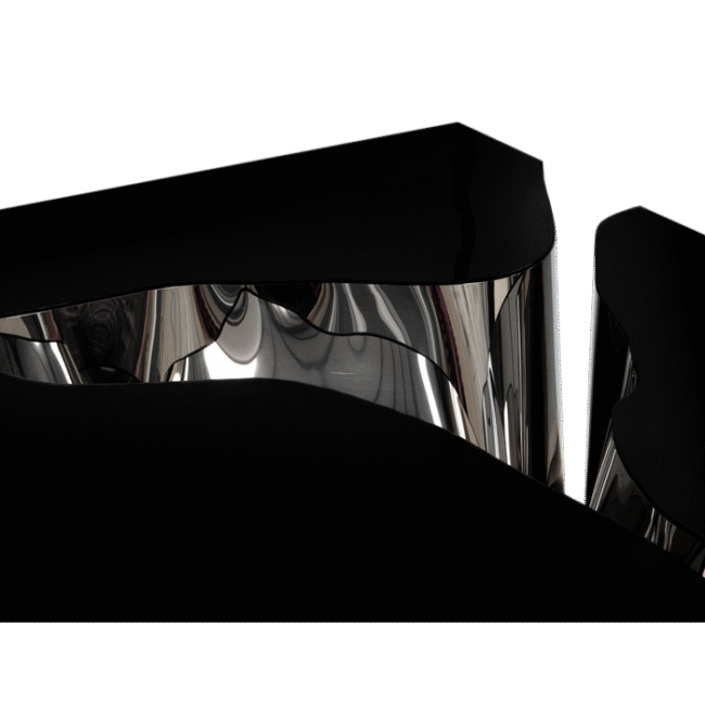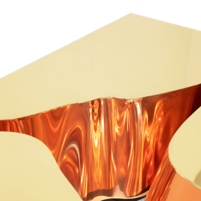 Its organic features are achieved through the manual fitting of the polished brass sheet, and a sharp exterior finished in polished stainless steel that portrays a perfect mirror. The hammered brass details and mirrored sides conveys both dynamics and elegance, a beautiful duality between power and refinement to bring a new contemporary verve into interior design.