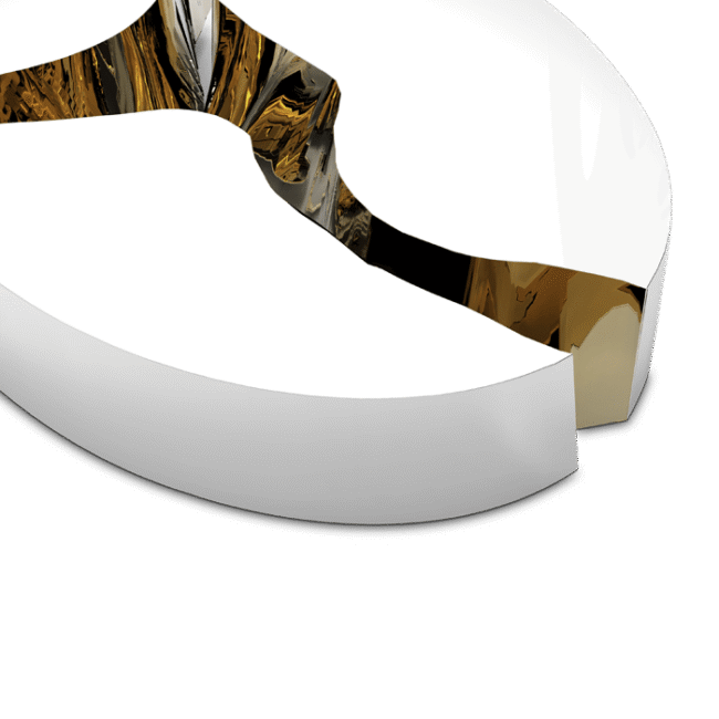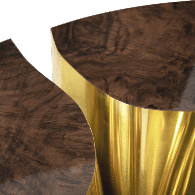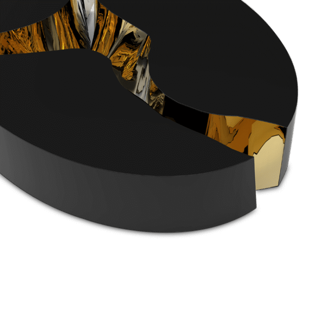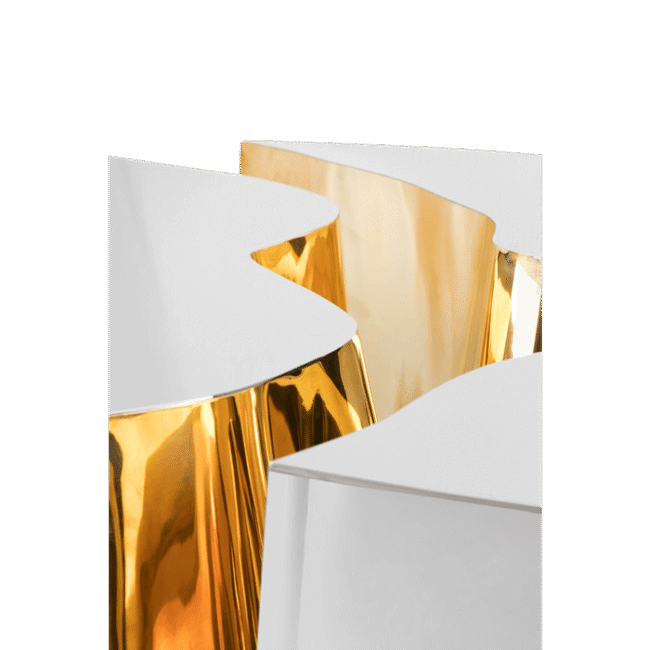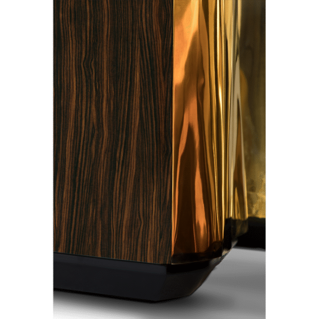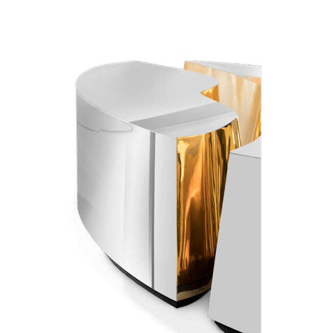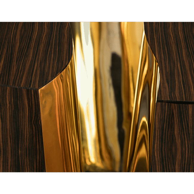Its organic features are achieved through the manual fitting of the polished brass sheet, and a sharp exterior finished in polished stainless steel that portrays a perfect mirror. The hammered brass details and mirrored sides conveys both dynamics and elegance, a beautiful duality between power and refinement to bring a new contemporary verve into interior design.