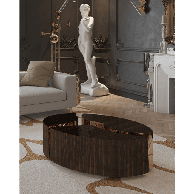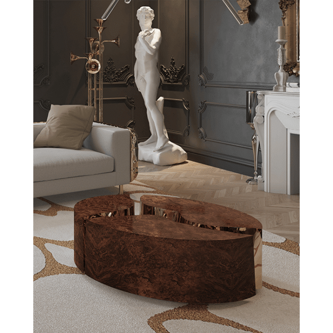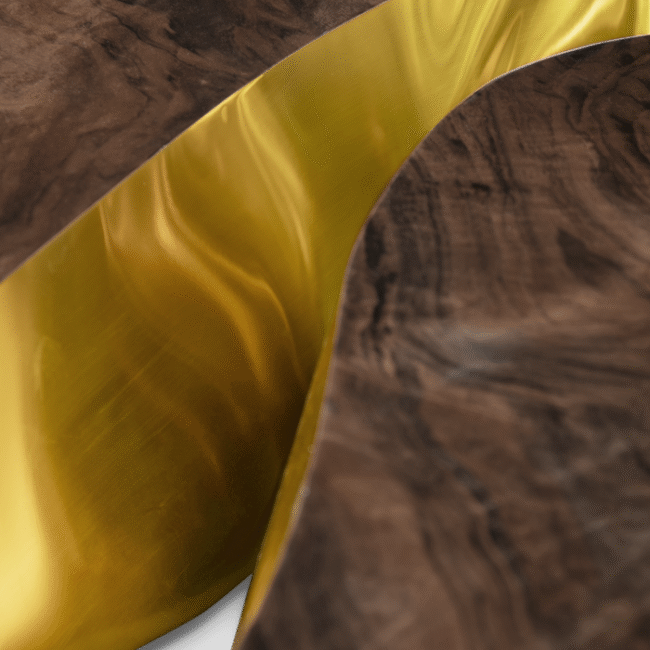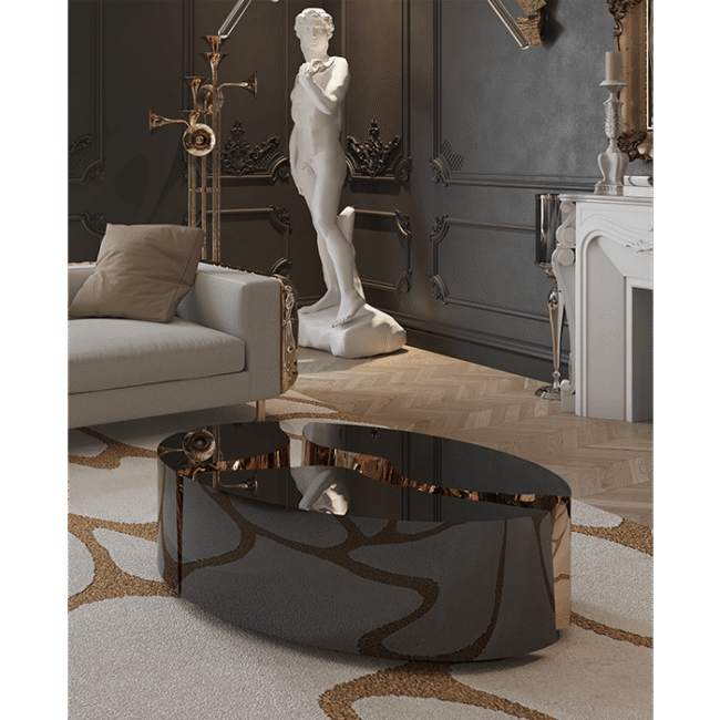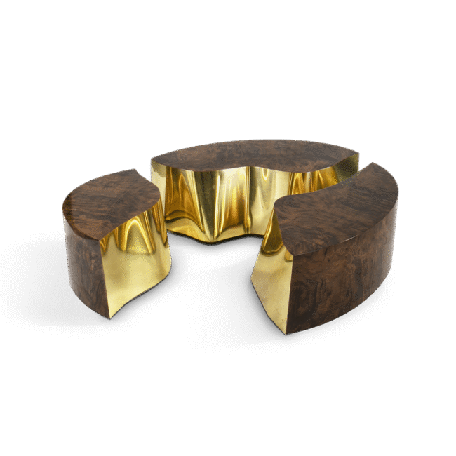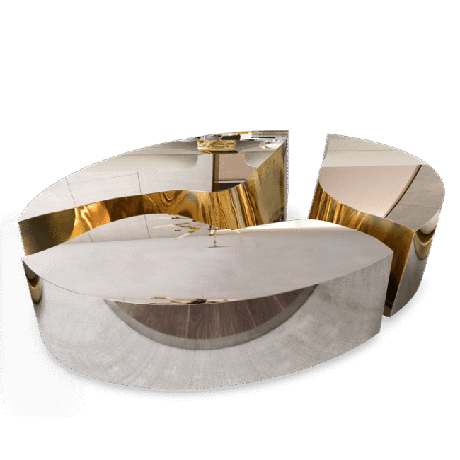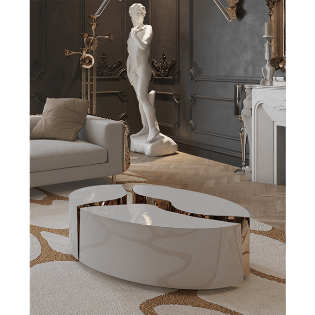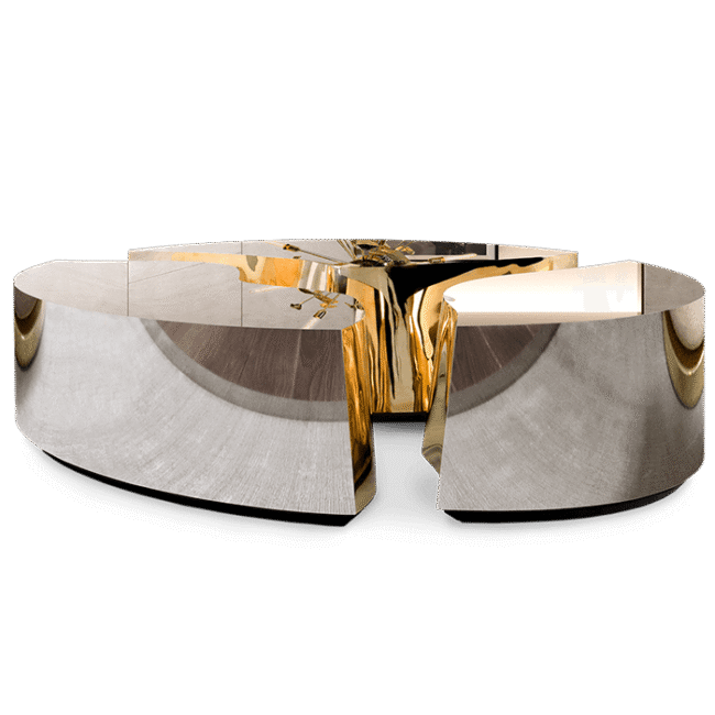 Its organic features are achieved through the manual fitting of the polished brass sheet, and a sharp exterior finished in polished stainless steel that portrays a perfect mirror. The hammered brass details and mirrored sides conveys both dynamics and elegance, a beautiful duality between power and refinement to bring a new contemporary verve into interior design.