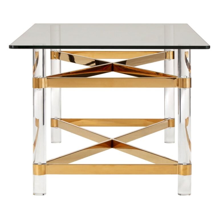 Laurence Coffee Table: Four cylindrical, clear acrylic legs support the Laurence coffee table’s substantial top. The transparent appearance of the tempered glass top complements the legs and creates a contemporary look. Two metal cross designs connect the four legs with a reflective gold finish lending them luxurious appeal.