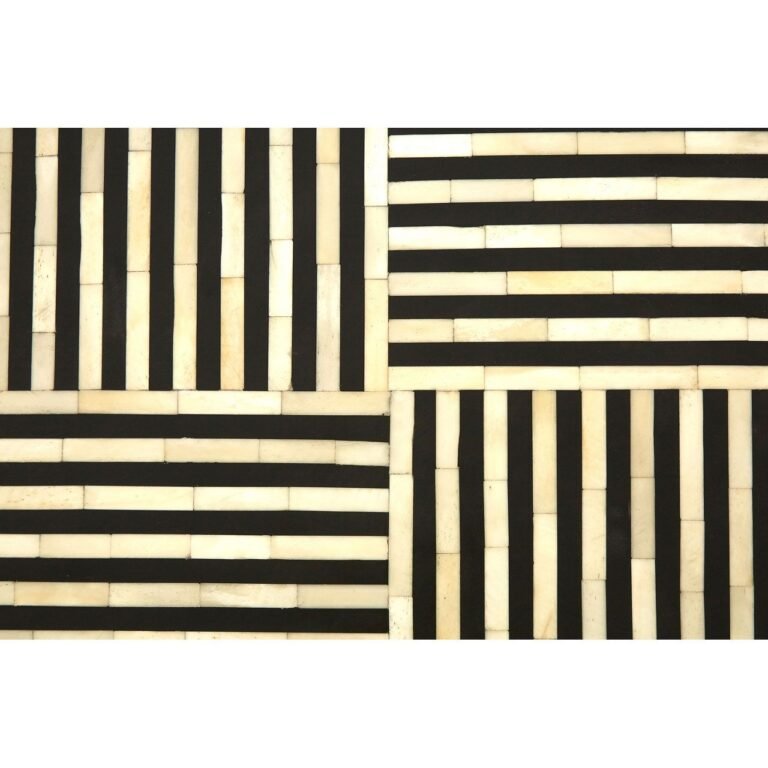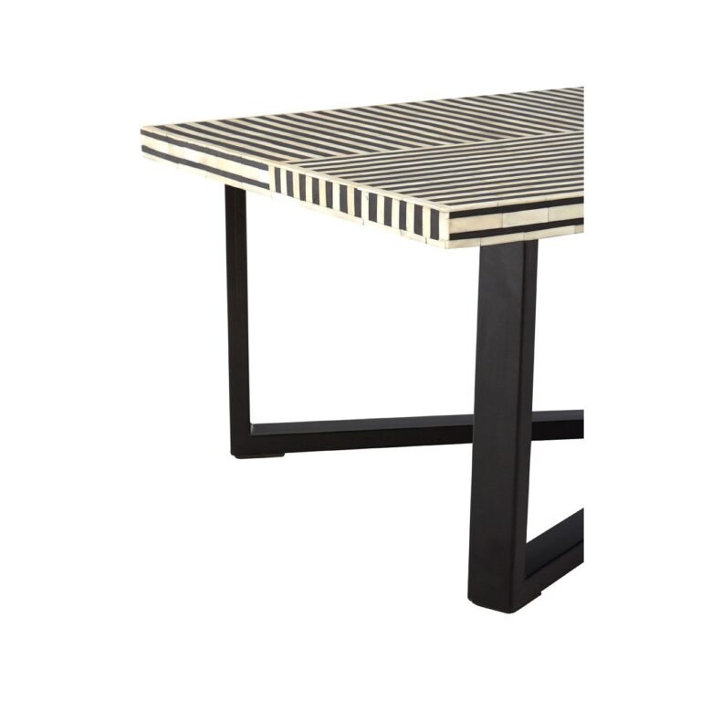 Ohom Coffee Table: This low profile coffee table stands on black metal legs which are formed into a lattice at the base. Small strips of natural buffalo bone are inlaid into the tabletop, configured asymmetrically over four quarters. Crafted by hand, each Ohom table boasts its own unique variations making it a one-of-a-kind accent piece for the living room. *This item is handcrafted so please expect slight variations to the finish*