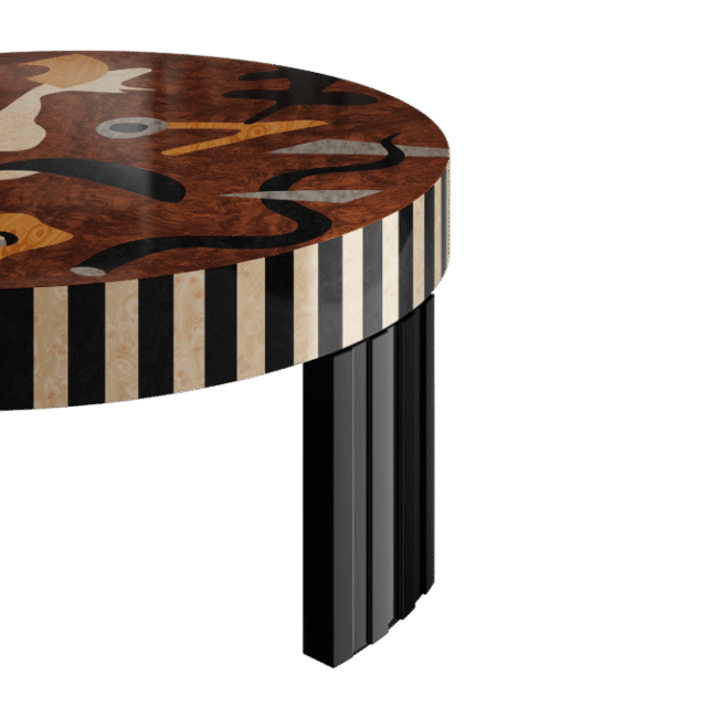 Palma Center Table is a hand-crafted center table that merges clean and minimalist lines with an artistic pattern. With a mid-century modern flair, the center table features a joyful and contemporary marquetry pattern, a magnificent work that reflects his signature pictorial signs, biomorphic forms, geometric shapes, and abstracted objects. The marquetry wood coffee table is made by skilled artisans using natural materials and preserving traditional techniques.